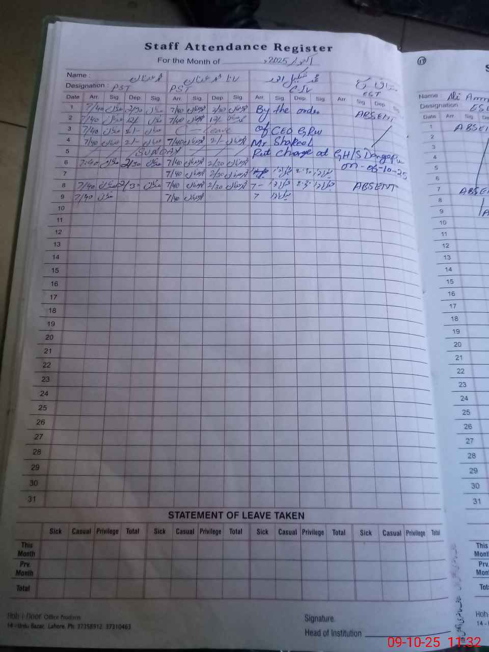 | CNIC | Full Name | Designation | R/C | Absence During Last Calender Month |