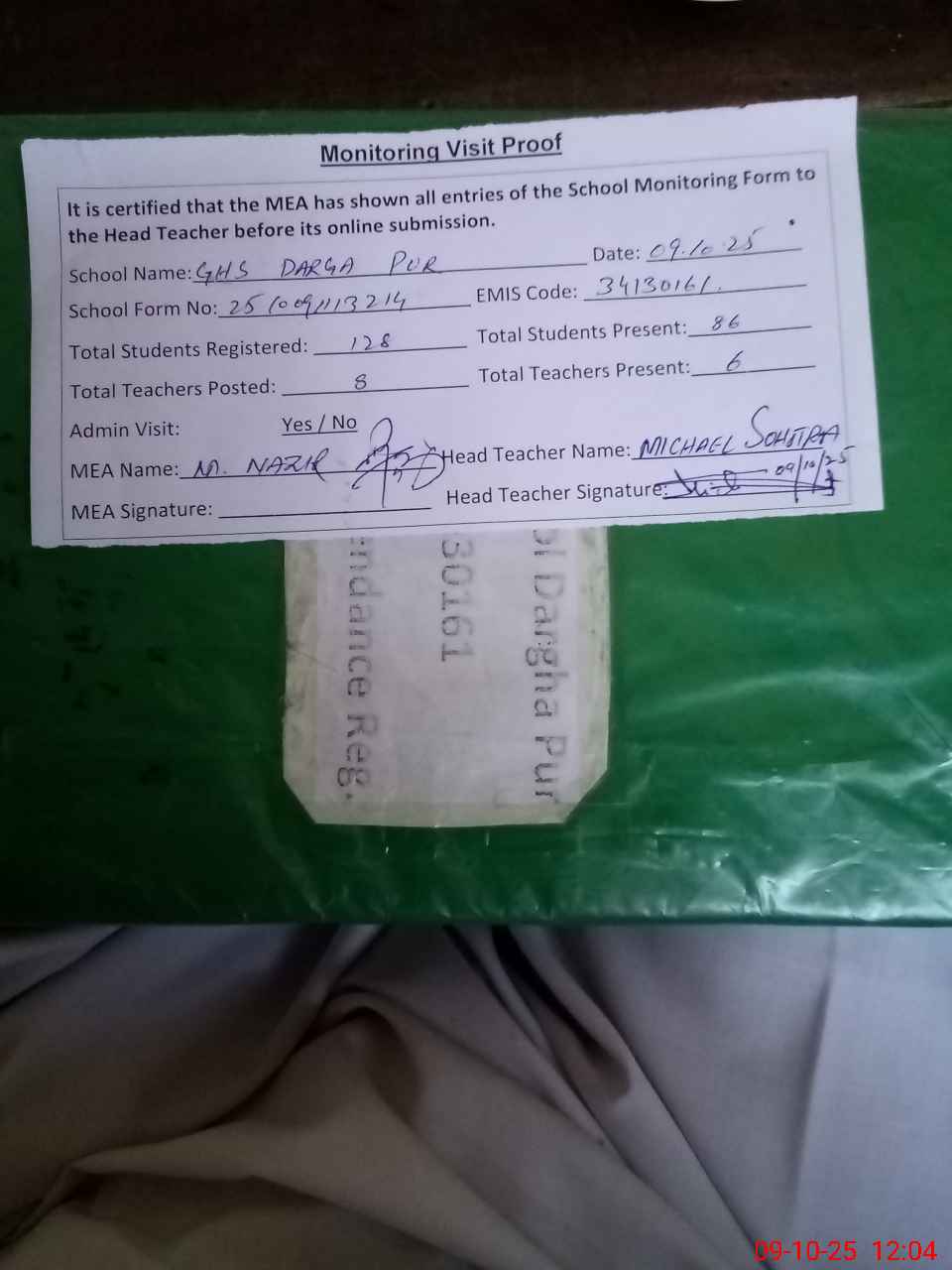 | Attendance Register | Head Teacher | MEA with School | Visit Proof |