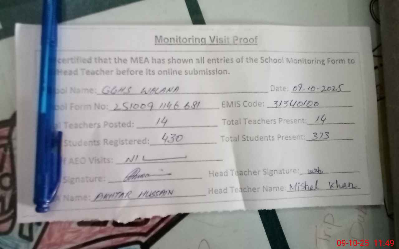 | Attendance Register | Head Teacher | MEA with School | Visit Proof |