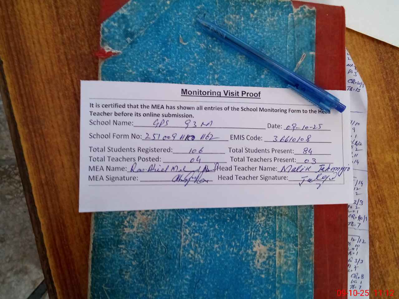 | Attendance Register | Head Teacher | MEA with School | Visit Proof |
