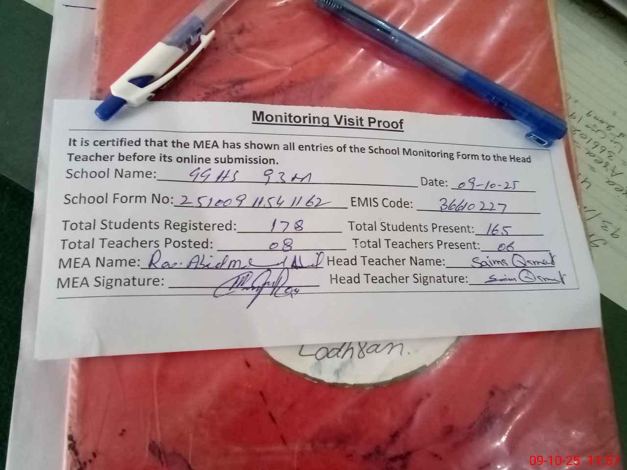 | Certified that this School was Inspected by the Undersigned MEA/DMO Today and the Information Stated Above is as Per Record. | |||||