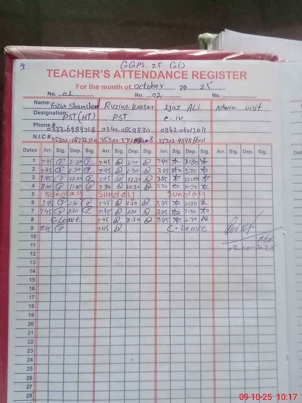 | CNIC | Full Name | Designation | R/C | Absence during last cal. month |