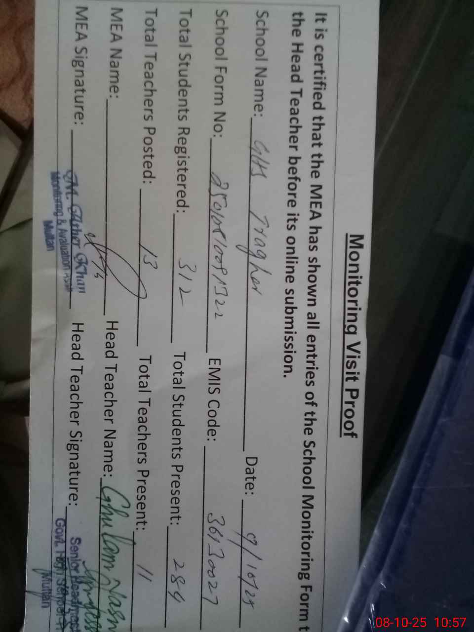| Attendance Register | Head Teacher | MEA with School | Visit Proof |