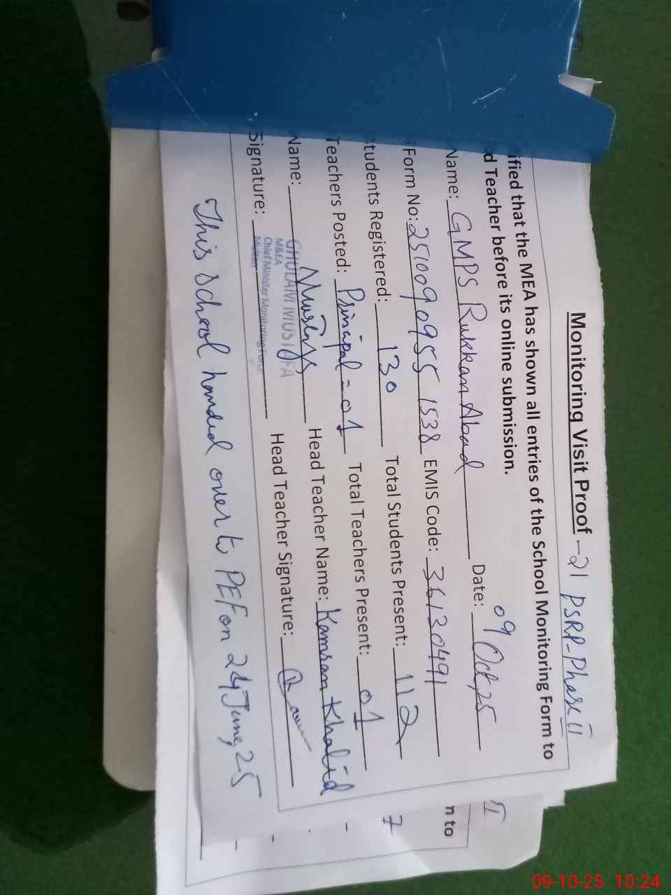 | Certified that this School was Inspected by the Undersigned MEA/DMO Today and the Information Stated Above is as Per Record. | |||||