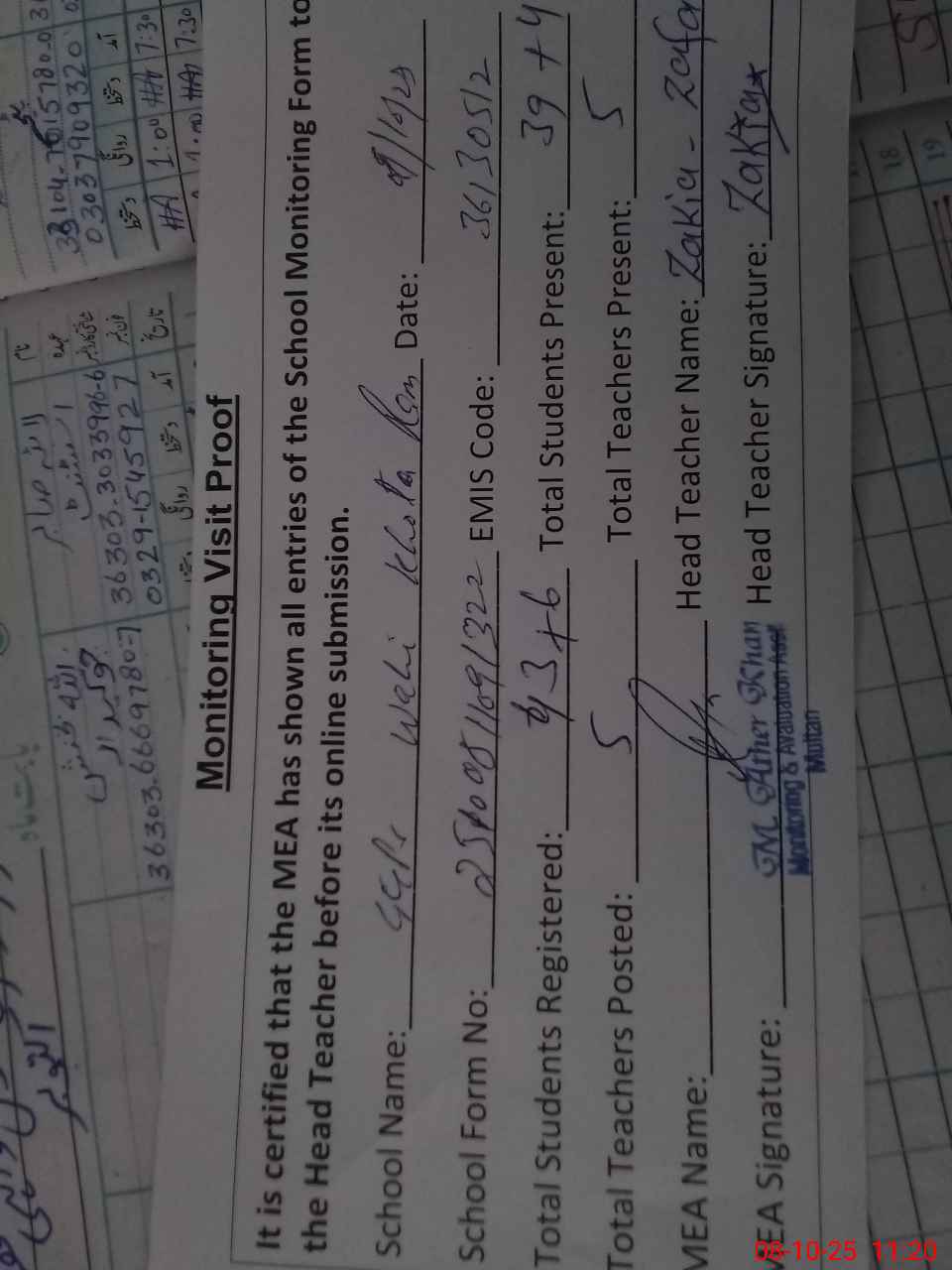 | Name: Za**** Za**** Designation: (School Headmaster's/Headmistress's) HEAD TEACHER Phone/Cell Number: 03**** |