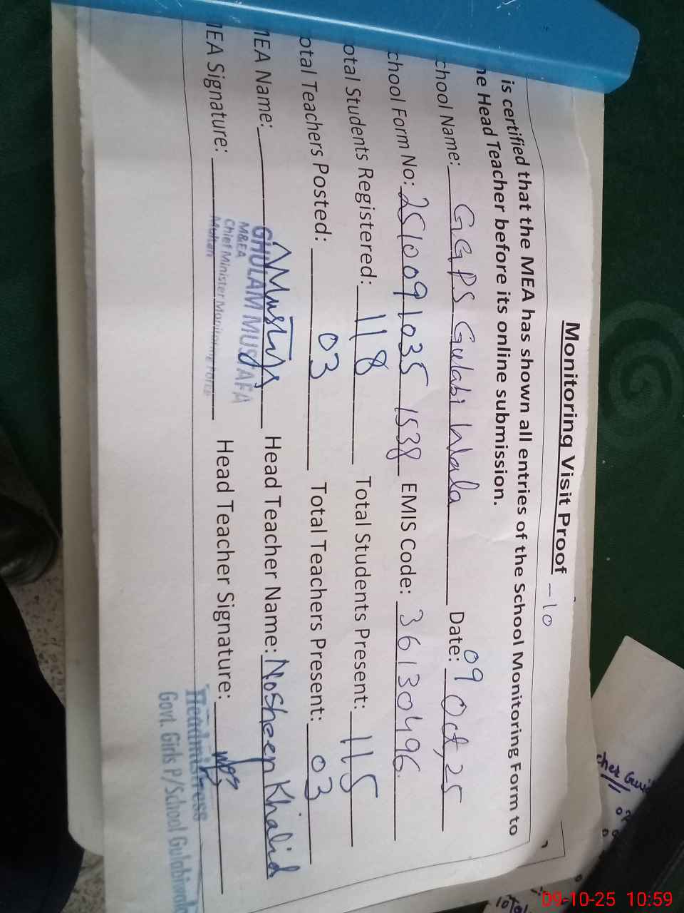 | Monitoring Date: 09-10-2025 | Start Time: 09-10-2025 10:35 AM | End Time: 09-10-2025 11:07 AM | Name of MEA: Gh**** Mu**** | |