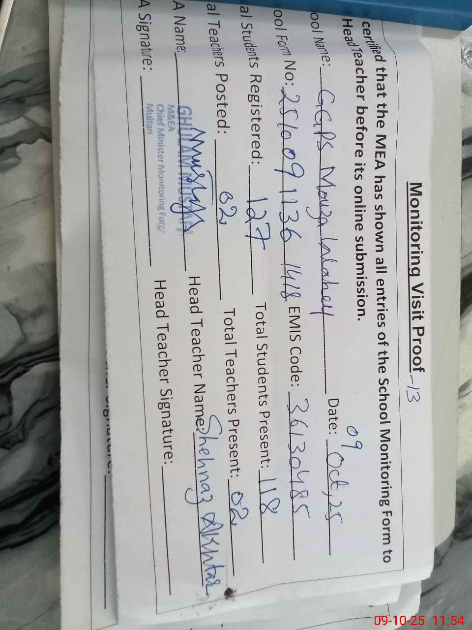 | Monitoring Date: 09-10-2025 | Start Time: 09-10-2025 11:36 AM | End Time: 09-10-2025 11:59 AM | Name of MEA: Gh**** Mu**** | |