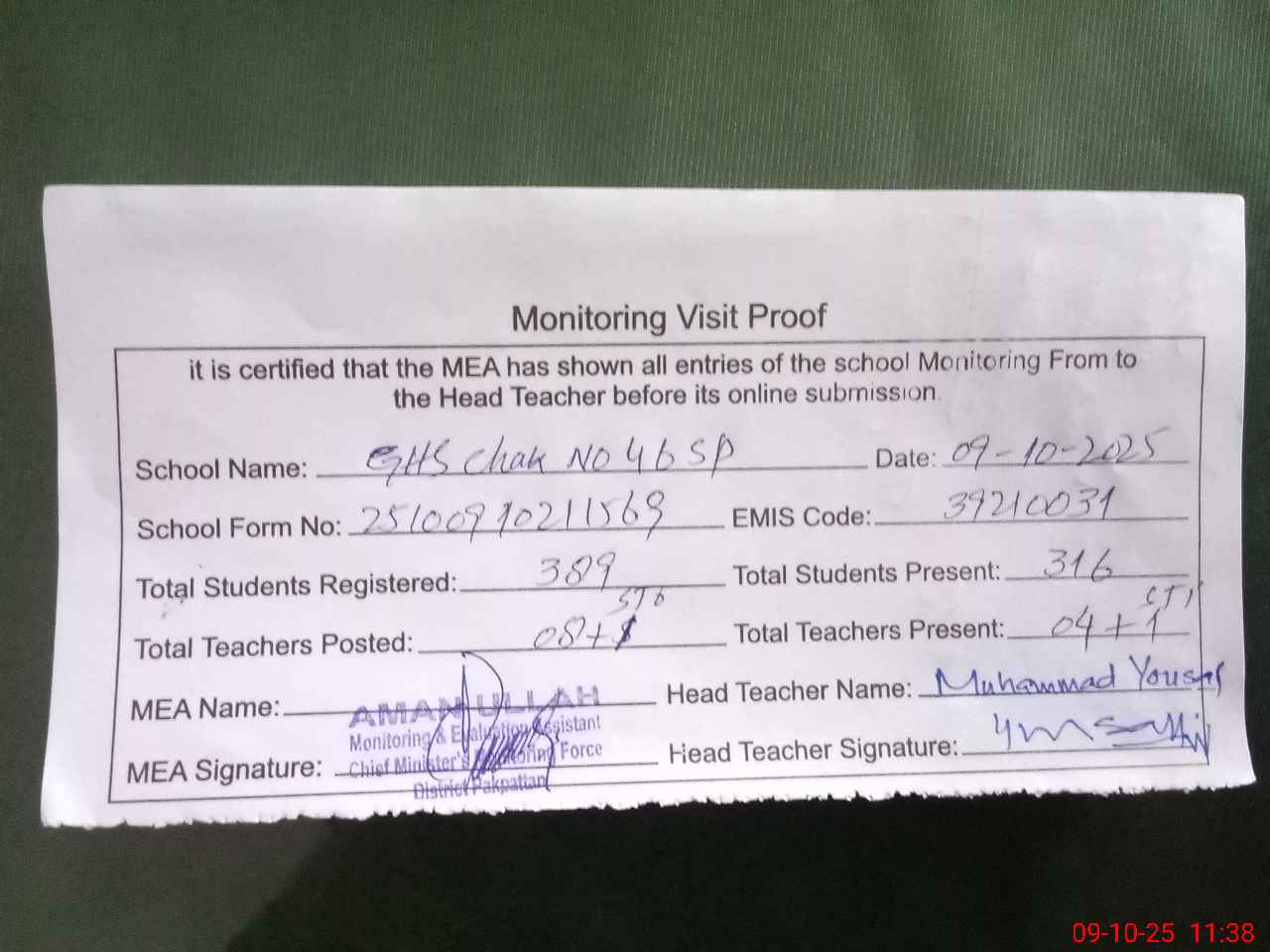 | EMIS Code: 39210031 | Name of School: GHS CHAK NO. 46/SP PAKPATTAN | |||