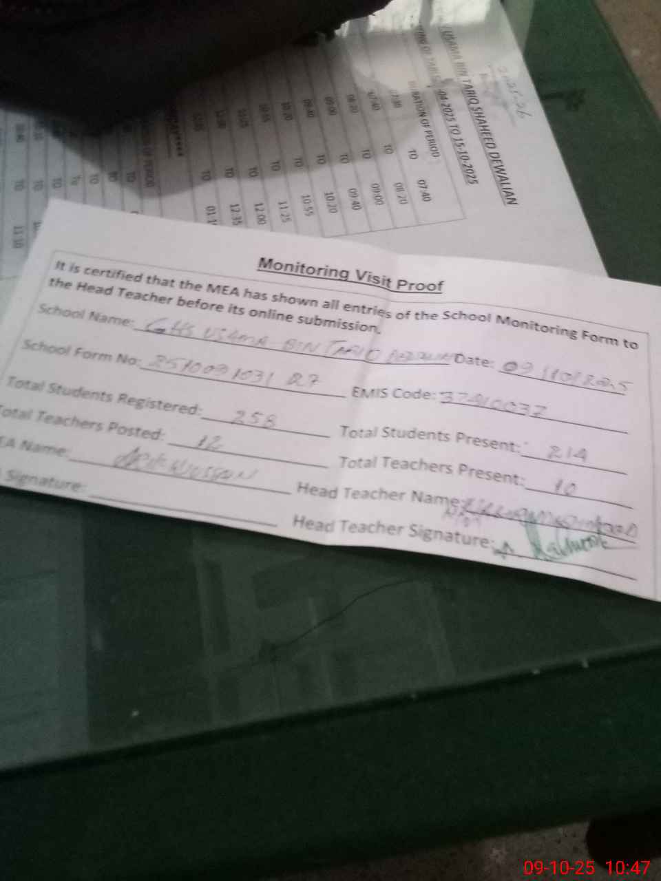 | Attendance Register | Head Teacher | MEA with School | Visit Proof |