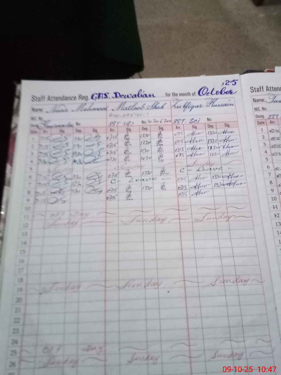 | CNIC | Full Name | Designation | R/C | Absence during last cal. month |