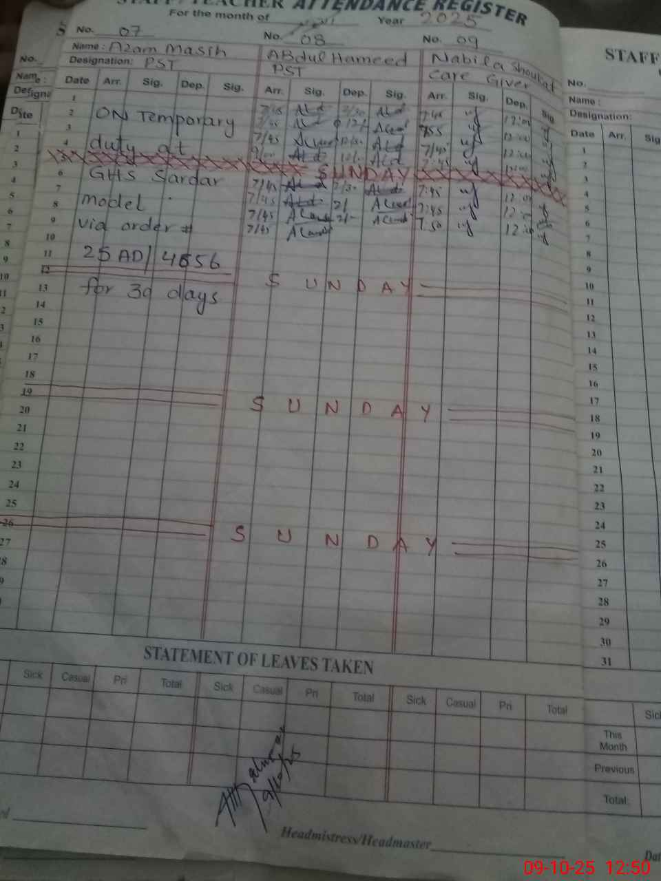 | Name: RI**** SA**** Designation: (School Headmaster's/Headmistress's) PST Phone/Cell Number: 03**** |