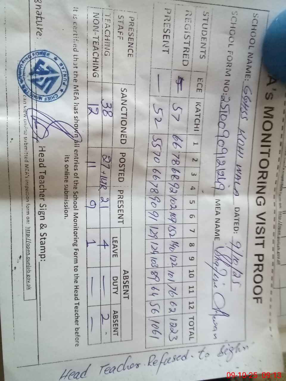 | Attendance Register | Head Teacher | MEA with School | Visit Proof |