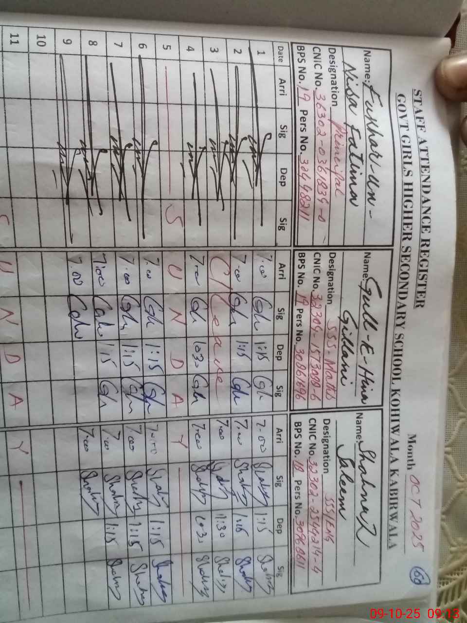 | CNIC | Full Name | Designation | R/C | Absence during last cal. month |