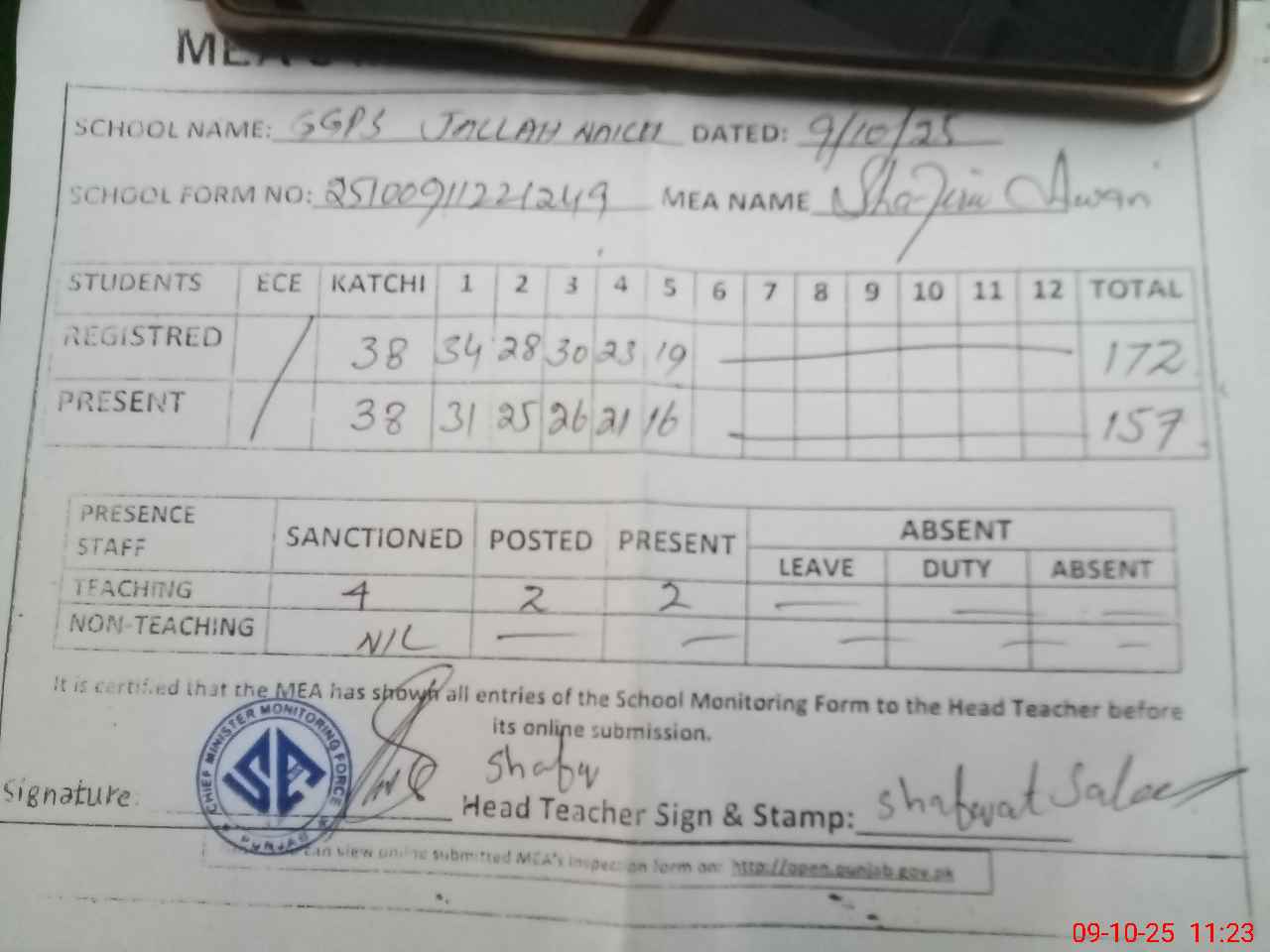 | Attendance Register | Head Teacher | MEA with School | Visit Proof |