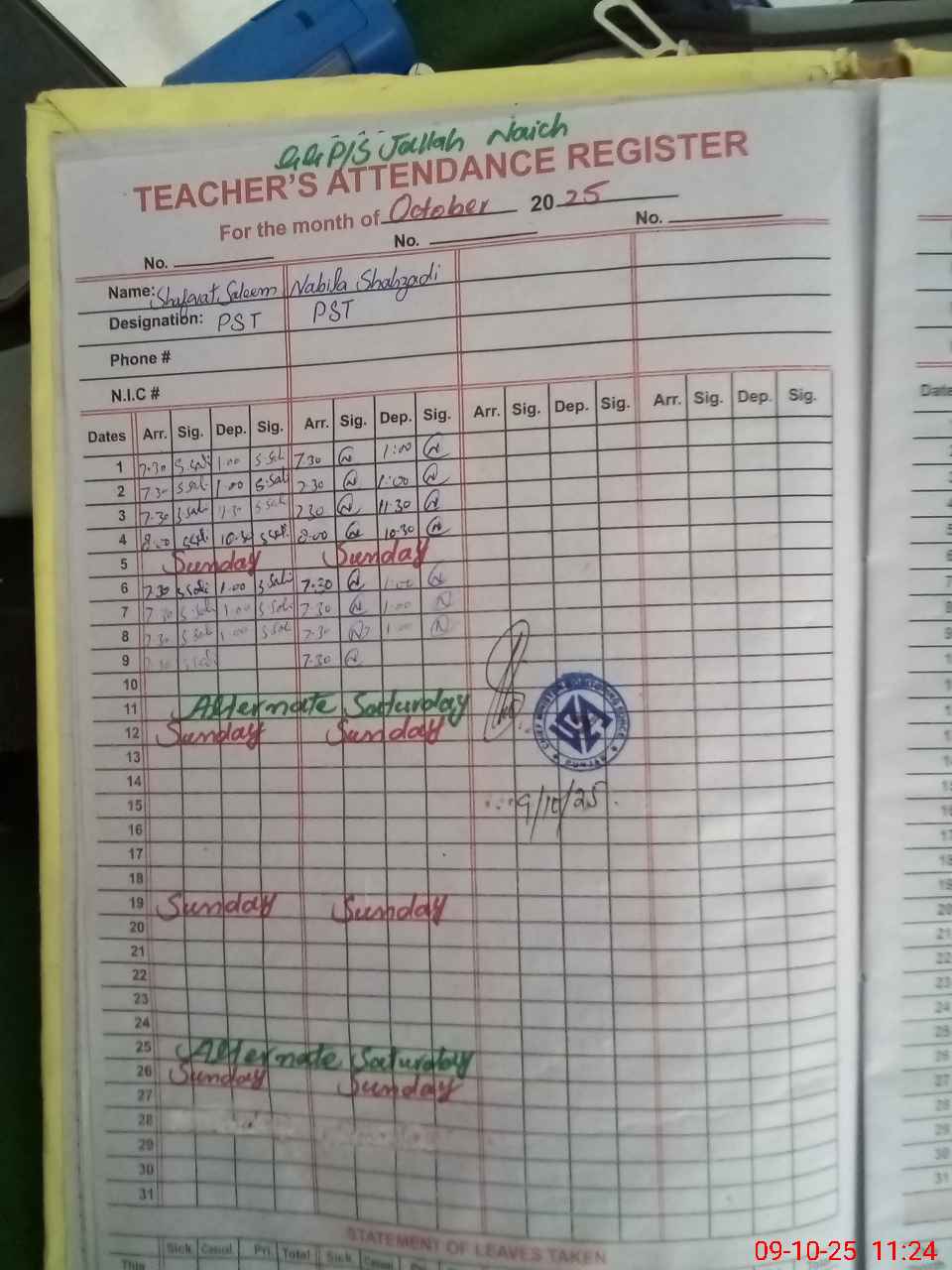 | Name: SH**** SA**** Designation: (School Headmaster's/Headmistress's) PST Phone/Cell Number: 03**** |