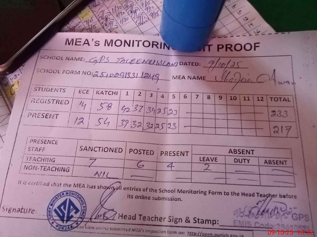 | Attendance Register | Head Teacher | MEA with School | Visit Proof |