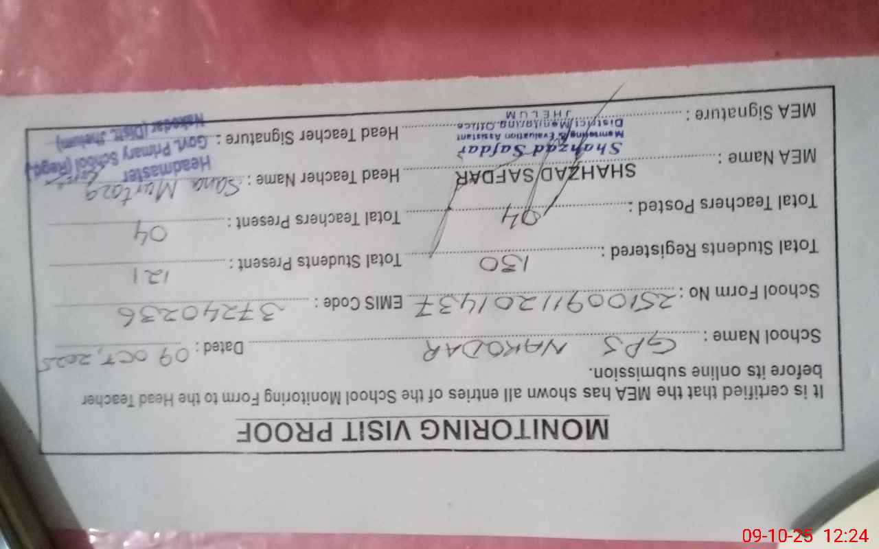 | Attendance Register | Head Teacher | MEA with School | Visit Proof |