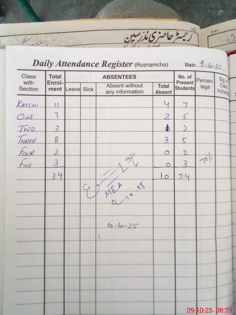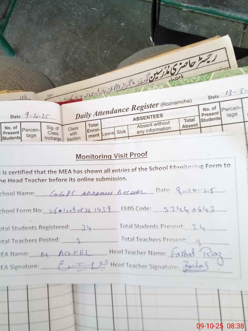 | Attendance Register | Head Teacher | MEA with School | Visit Proof |