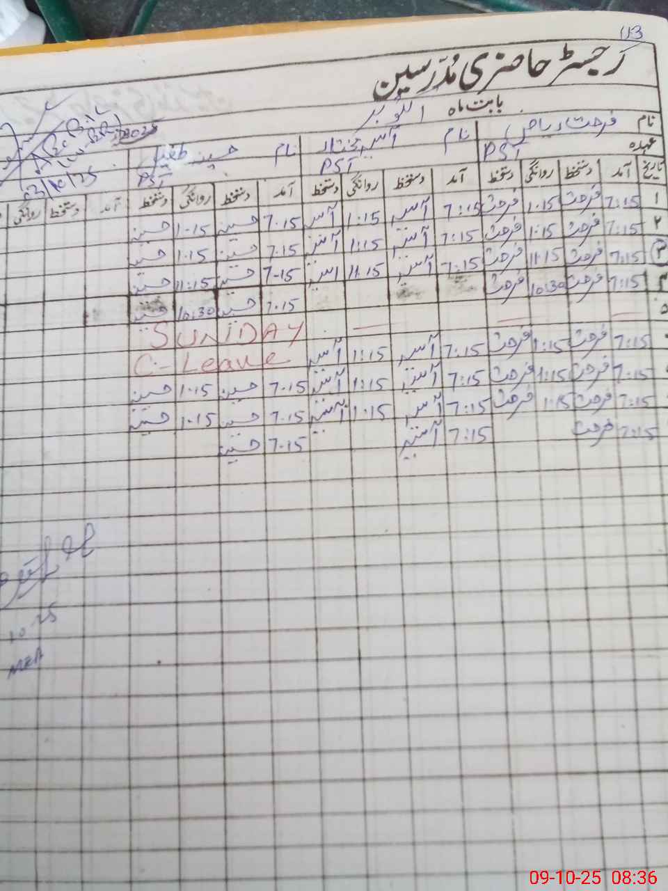 | CNIC | Full Name | Designation | R/C | Absence During Last Calender Month |