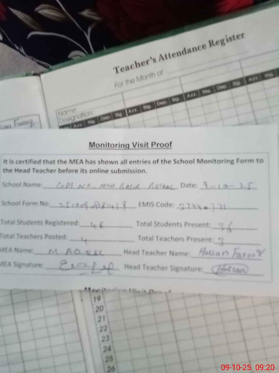 | Attendance Register | Head Teacher | MEA with School | Visit Proof |