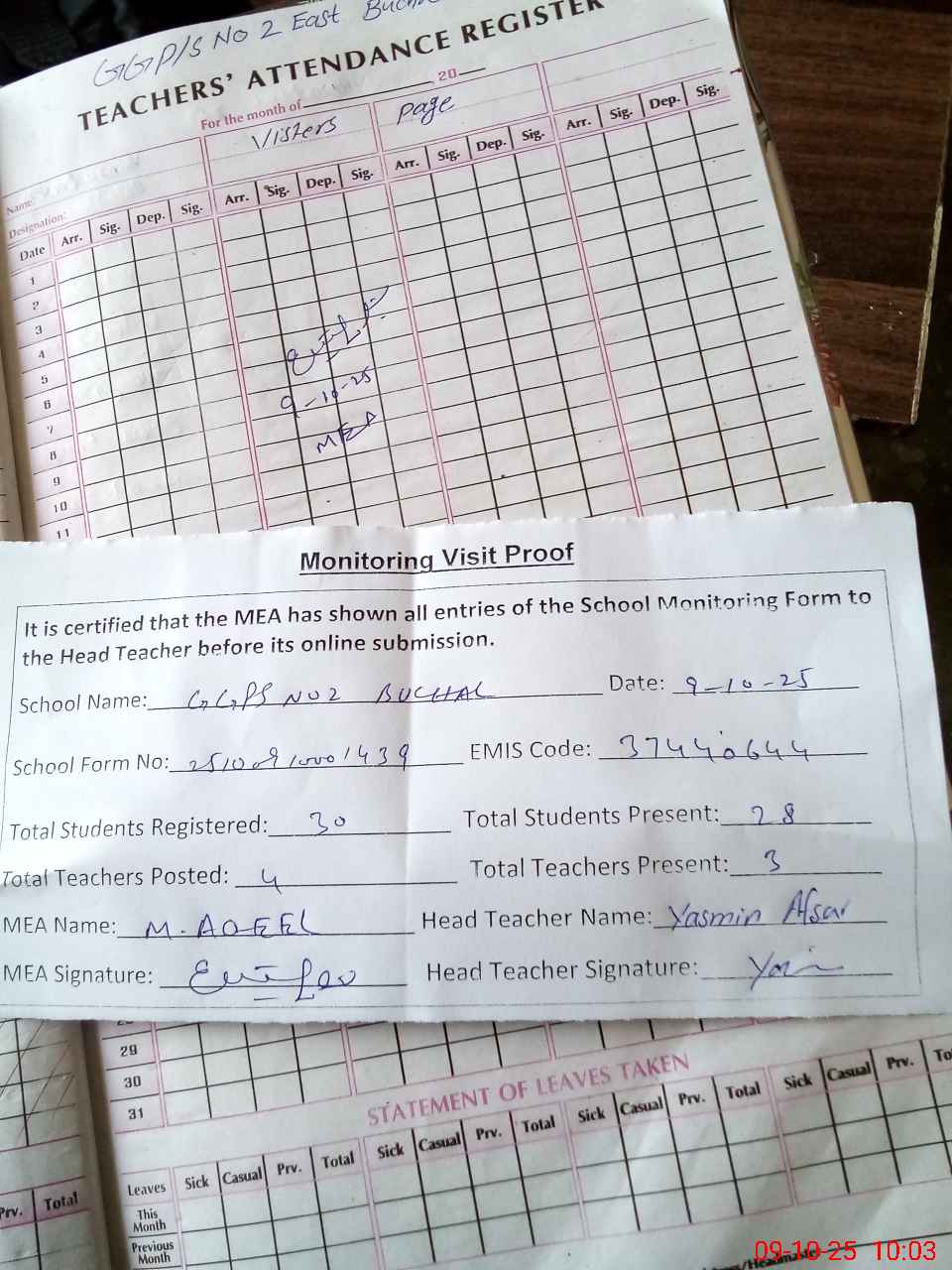 | Attendance Register | Head Teacher | MEA with School | Visit Proof |