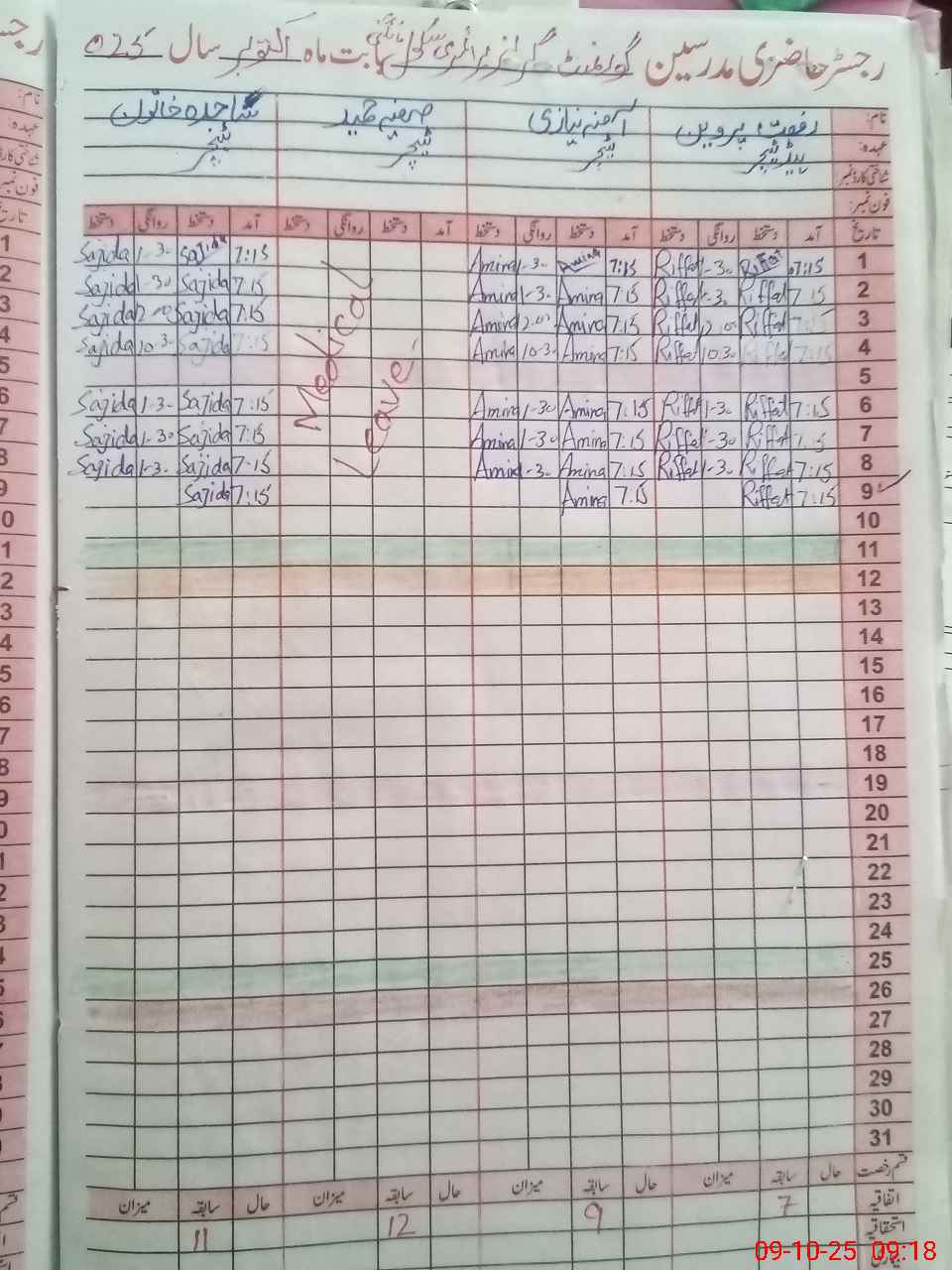 | Total no. of Classrooms: 4 No. of Classrooms Used for Teaching: 4 No. of Classrooms Storing Old Furniture, FTBs, etc: 0Comments if Any: 01 toilet is blocked PST Safia Hameed is absent her medical leave not approved till date |