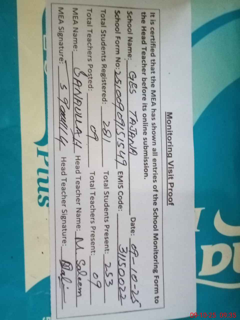 | Attendance Register | Head Teacher | MEA with School | Visit Proof |
