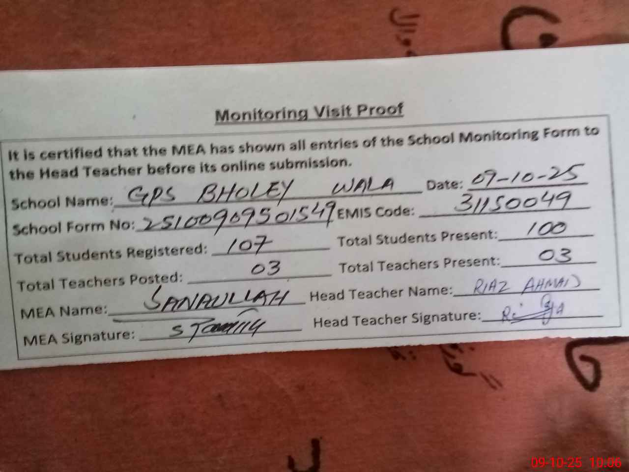 | EMIS Code: 31150049 | Name of School: GPS BHOLEY WALA | |||