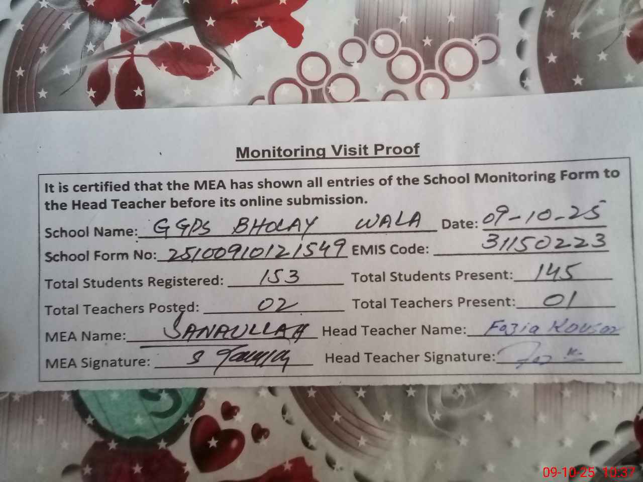 | Attendance Register | Head Teacher | MEA with School | Visit Proof |