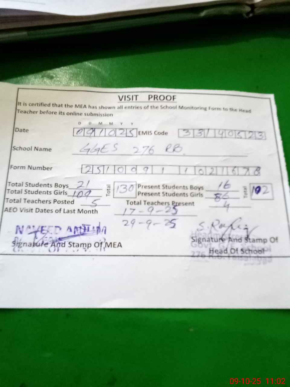 | Attendance Register | Head Teacher | MEA with School | Visit Proof |