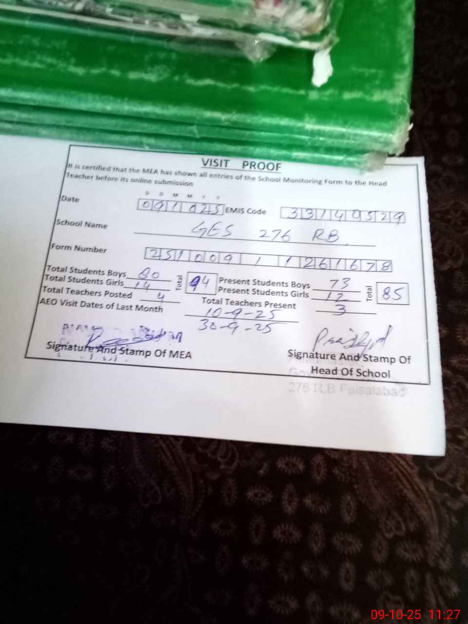 | Attendance Register | Head Teacher | MEA with School | Visit Proof |