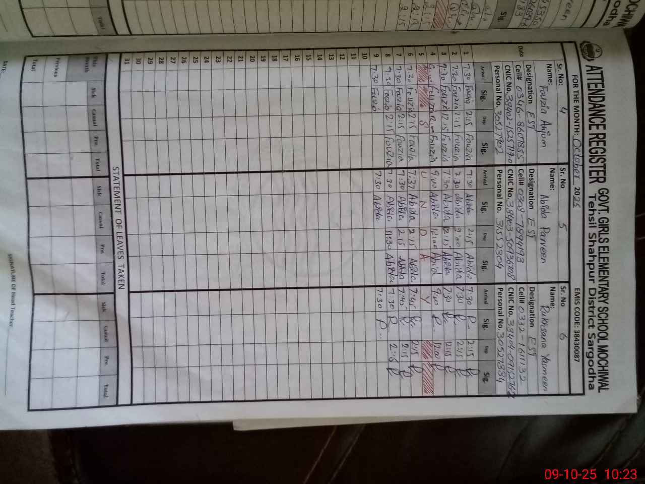 | CNIC | Full Name | Designation | R/C | Absence During Last Calender Month |