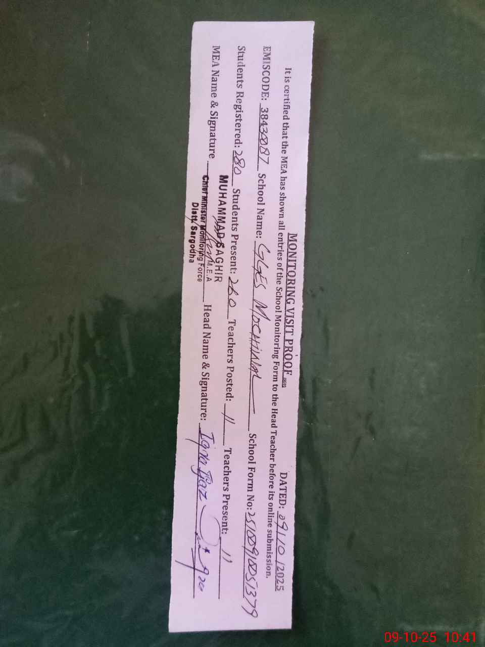| Certified that this School was Inspected by the Undersigned MEA/DMO Today and the Information Stated Above is as Per Record. | |||||