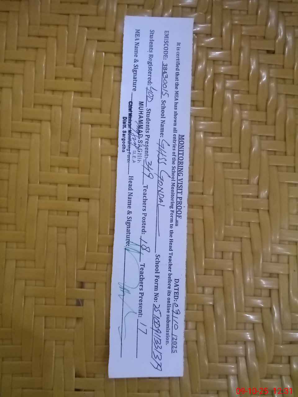 | EMIS Code: 38430015 | Name of School: GHSS GONDAL SARGODHA | |||