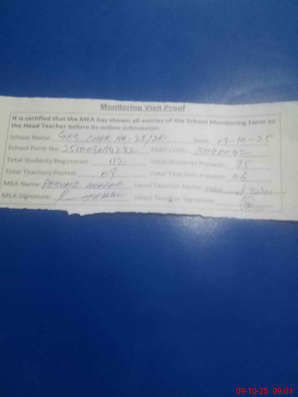 | Attendance Register | Head Teacher | MEA with School | Visit Proof |
