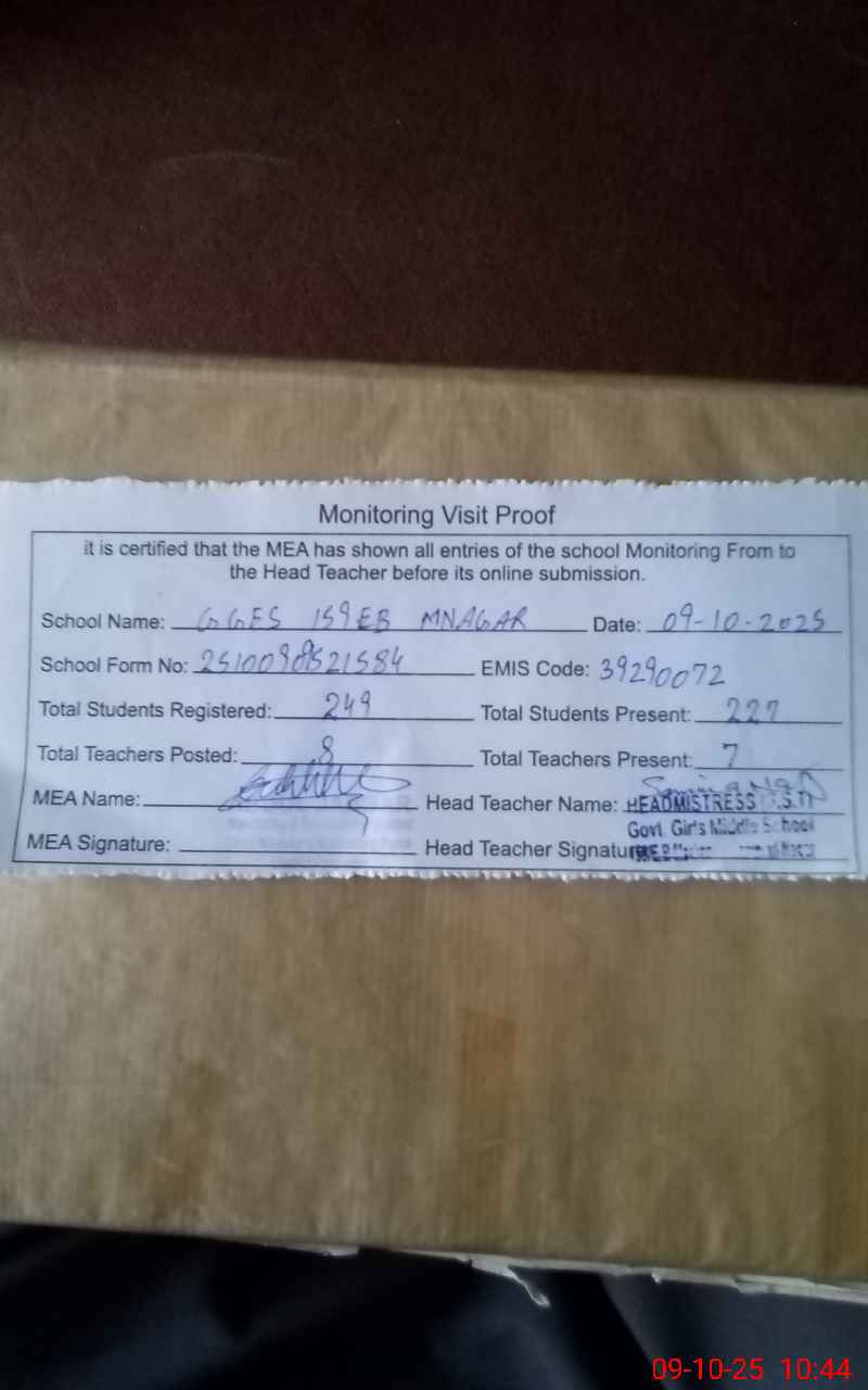 | Monitoring Date: 09-10-2025 | Start Time: 09-10-2025 09:52 AM | End Time: 09-10-2025 10:45 AM | Name of MEA: AB**** JA**** | |