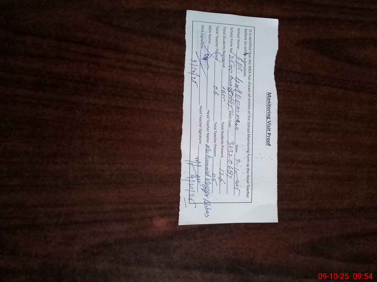 | Attendance Register | Head Teacher | MEA with School | Visit Proof |