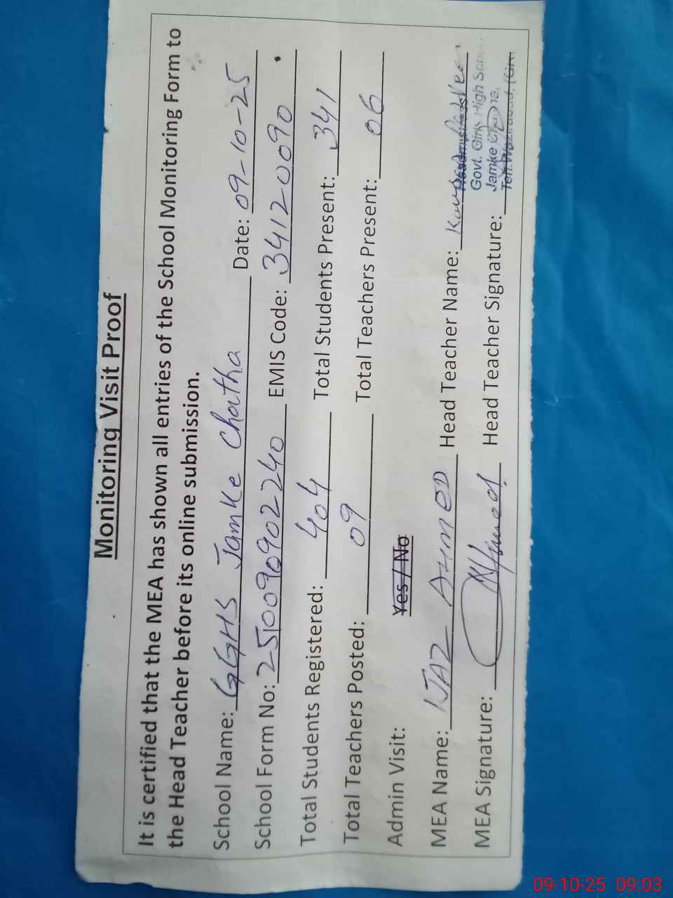 | Attendance Register | Head Teacher | MEA with School | Visit Proof |