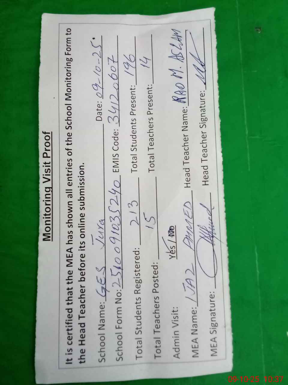 | Attendance Register | Head Teacher | MEA with School | Visit Proof |