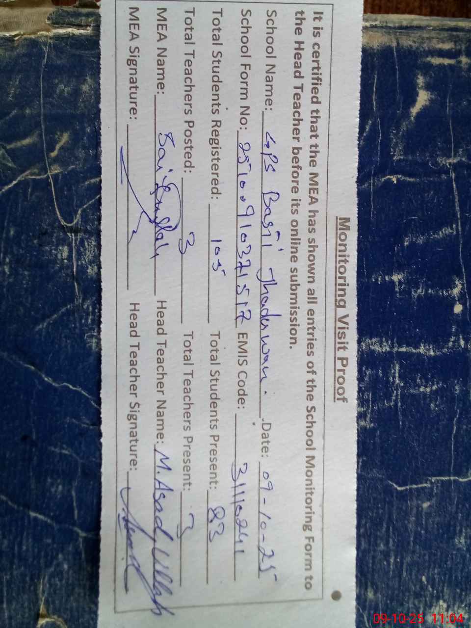 | Attendance Register | Head Teacher | MEA with School | Visit Proof |