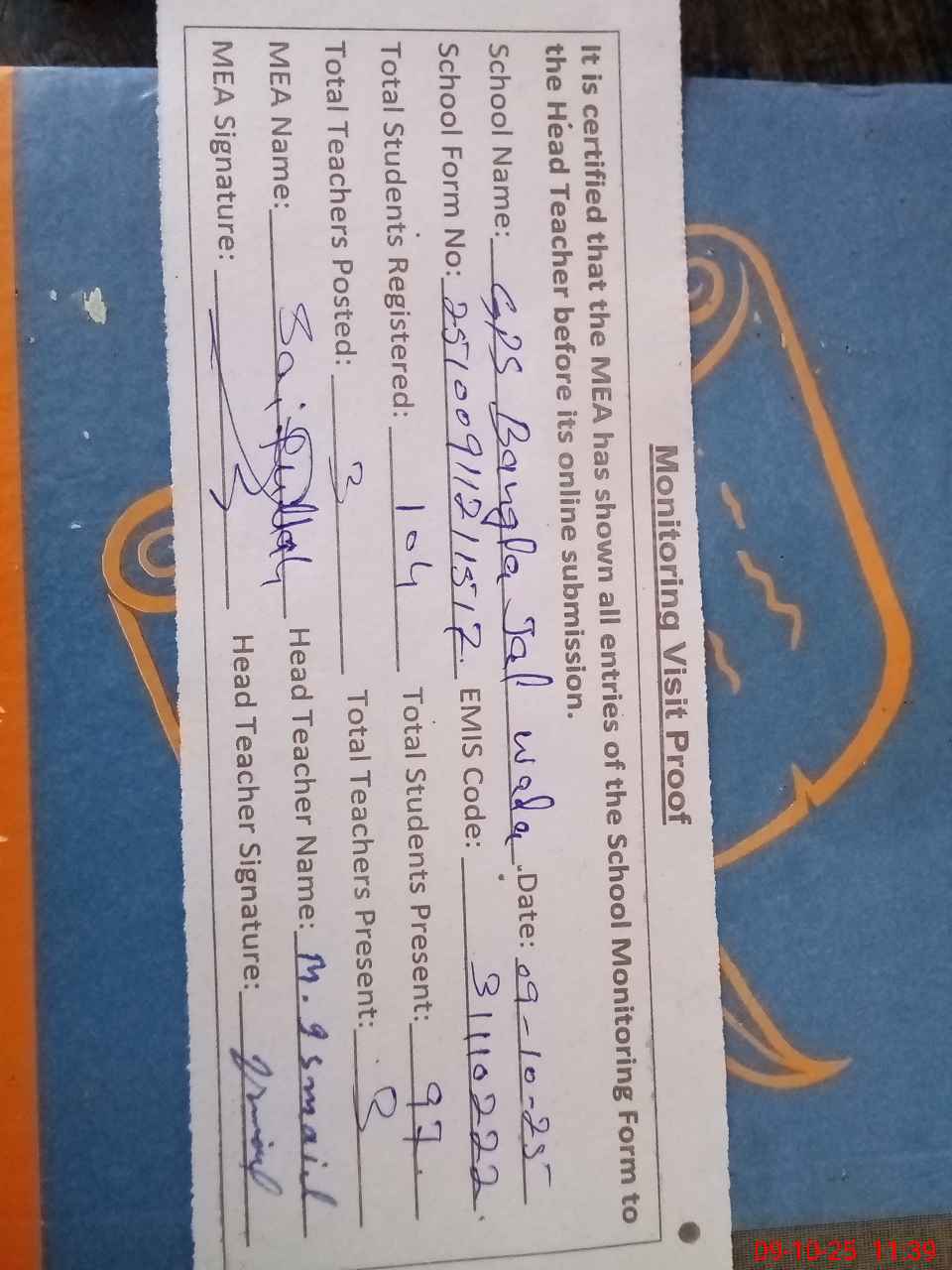 | EMIS Code: 31110222 | Name of School: GPS BANGLA JAL WALA | |||