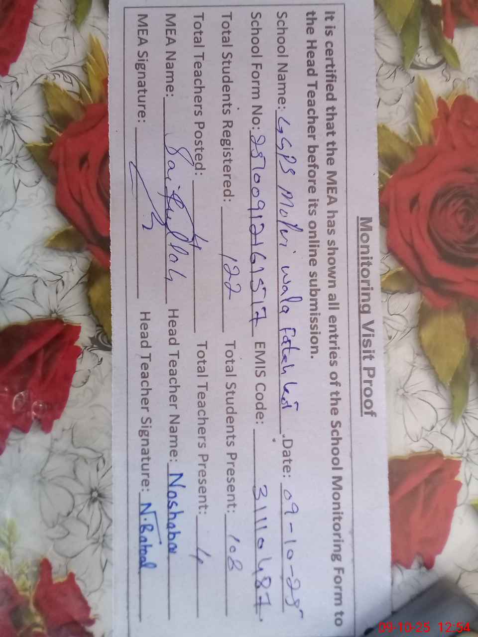 | EMIS Code: 31110487 | Name of School: GGPS MOLVI WALA FATEH KOT | |||
