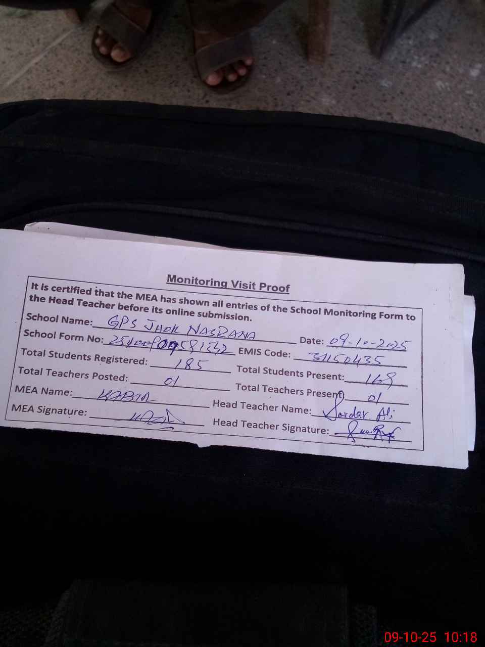 | Attendance Register | Head Teacher | MEA with School | Visit Proof |
