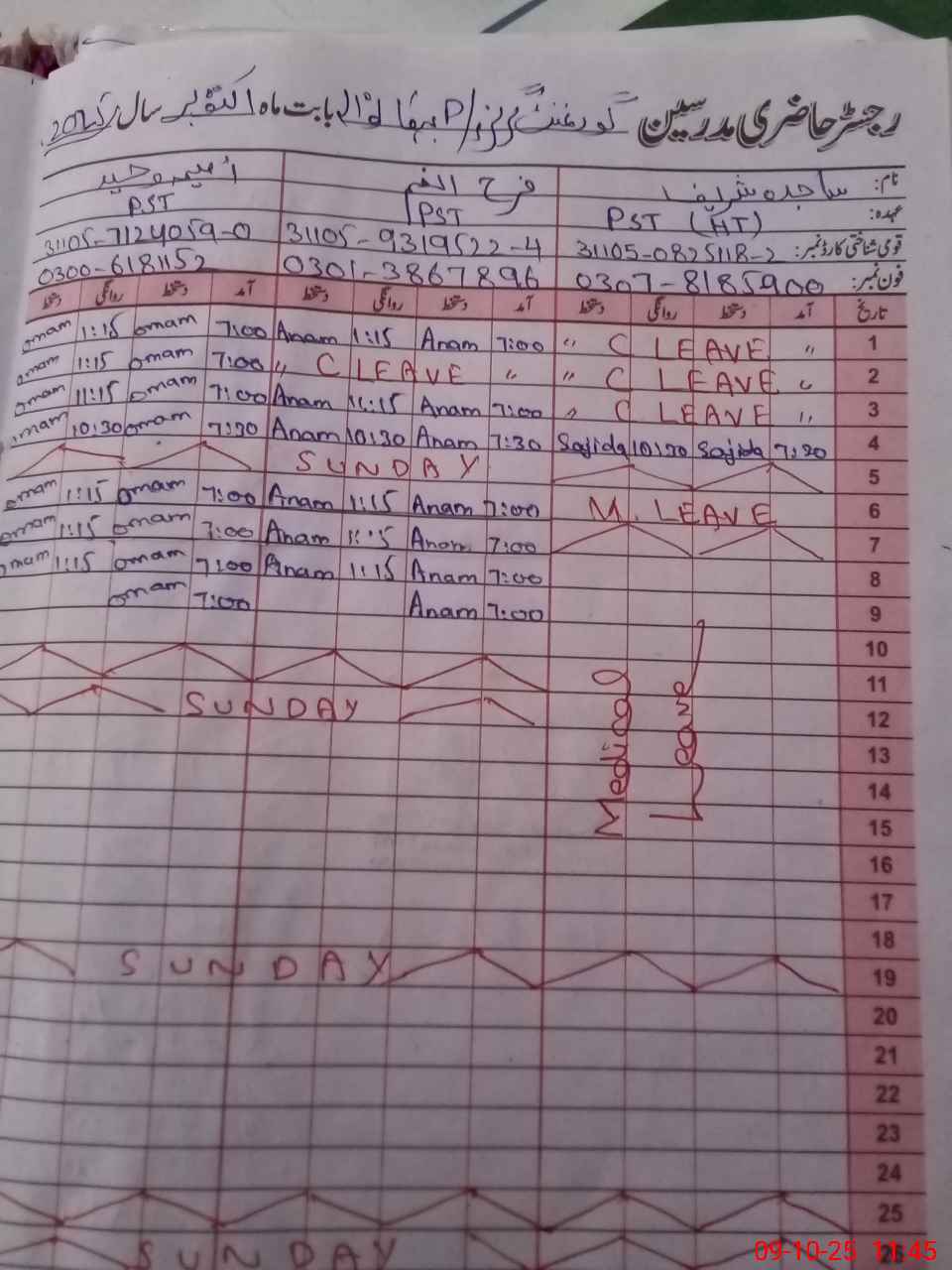 | CNIC | Full Name | Designation | R/C | Absence during last cal. month |