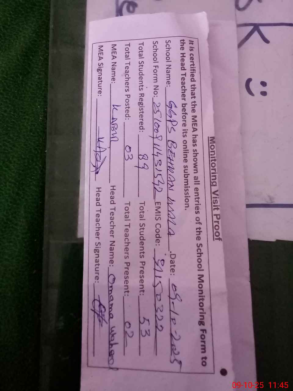 | Attendance Register | Head Teacher | MEA with School | Visit Proof |
