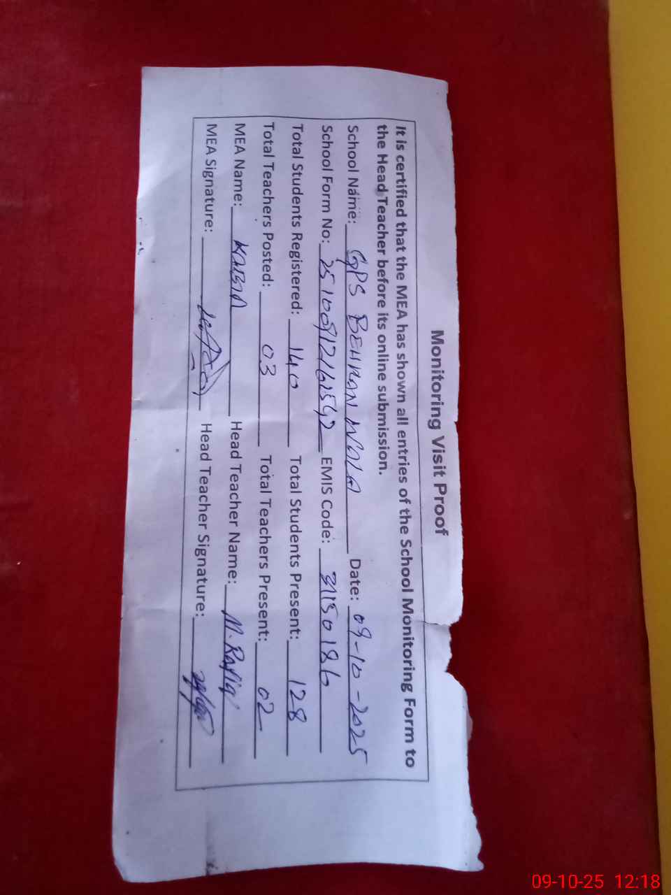 | Attendance Register | Head Teacher | MEA with School | Visit Proof |