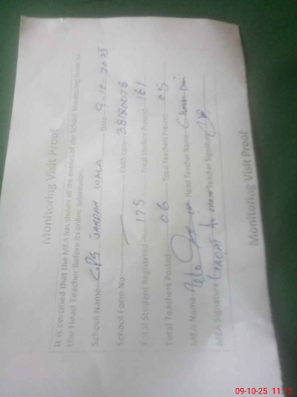| Attendance Register | Head Teacher | MEA with School | Visit Proof |