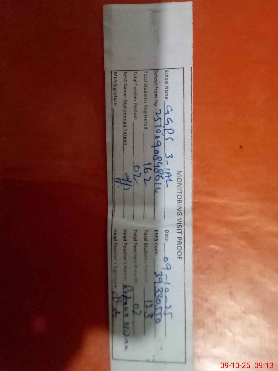 | Attendance Register | Head Teacher | MEA with School | Visit Proof |