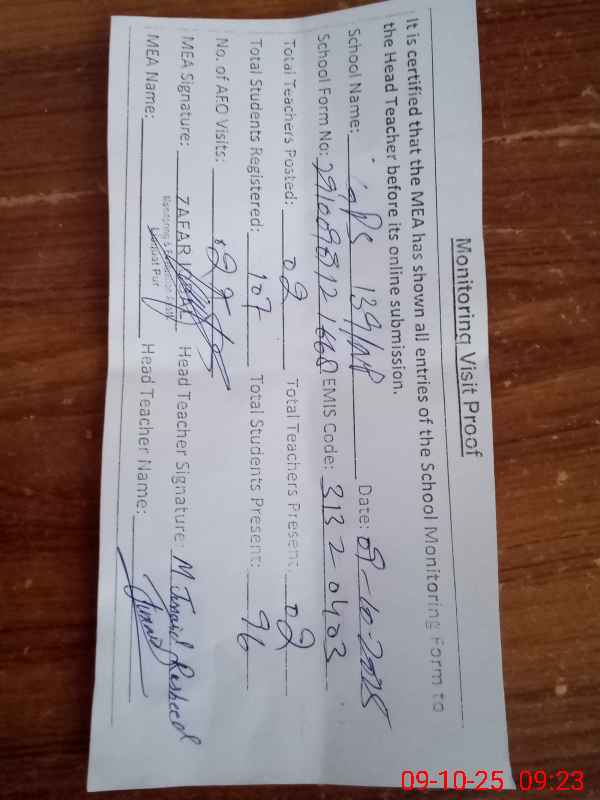 | Attendance Register | Head Teacher | MEA with School | Visit Proof |