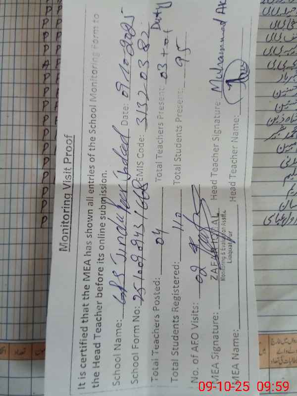 | Attendance Register | Head Teacher | MEA with School | Visit Proof |